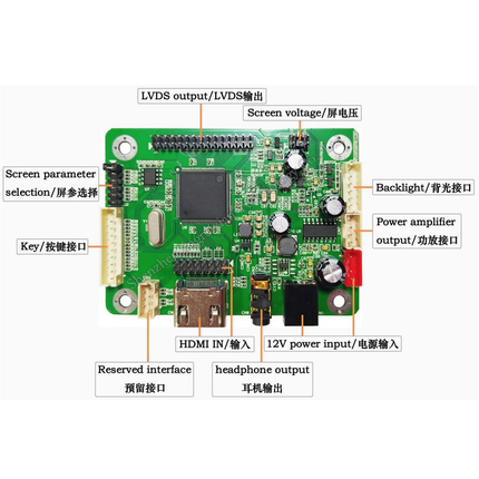 It is a multi-function display driver board combines 1 HDMI1.4 input interface, supports 2 port LVDS output up to 186MHz, supports headphone output and 3 watts dual channel audio amplifier output.
